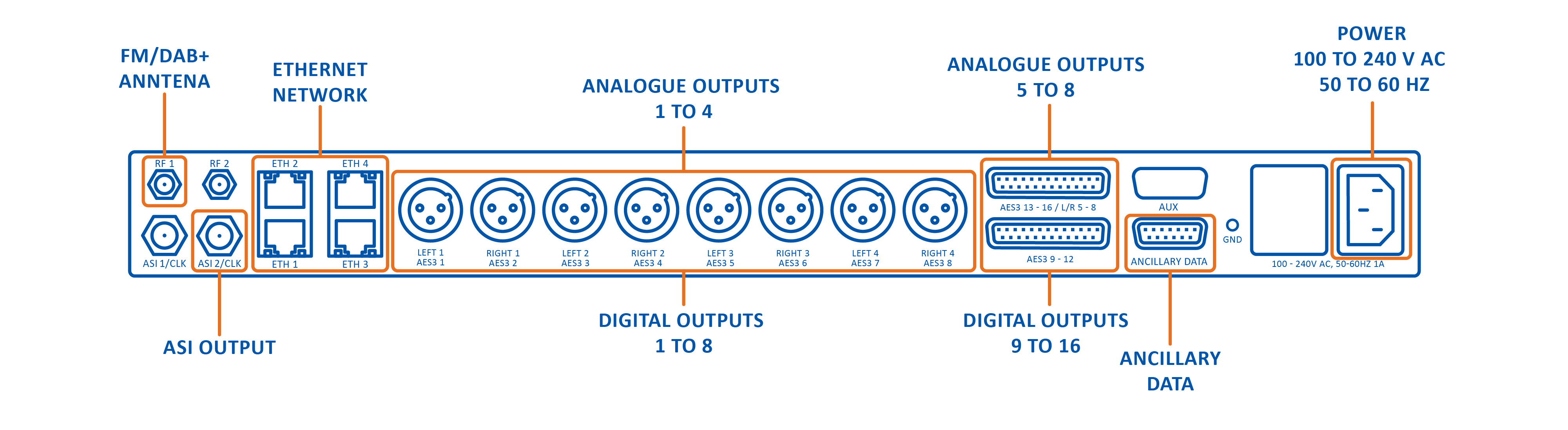 The Q9X-T is a high-density FM/DAB+ receiver and transcoder for professional broadcast environments. It enables simultaneous monitoring of up to 12 programmes, providing AES3 or analog audio outputs, or optional transcoding to DVB-compliant MPEG transport streams for efficient redistribution in cable and IP-based broadcast networ